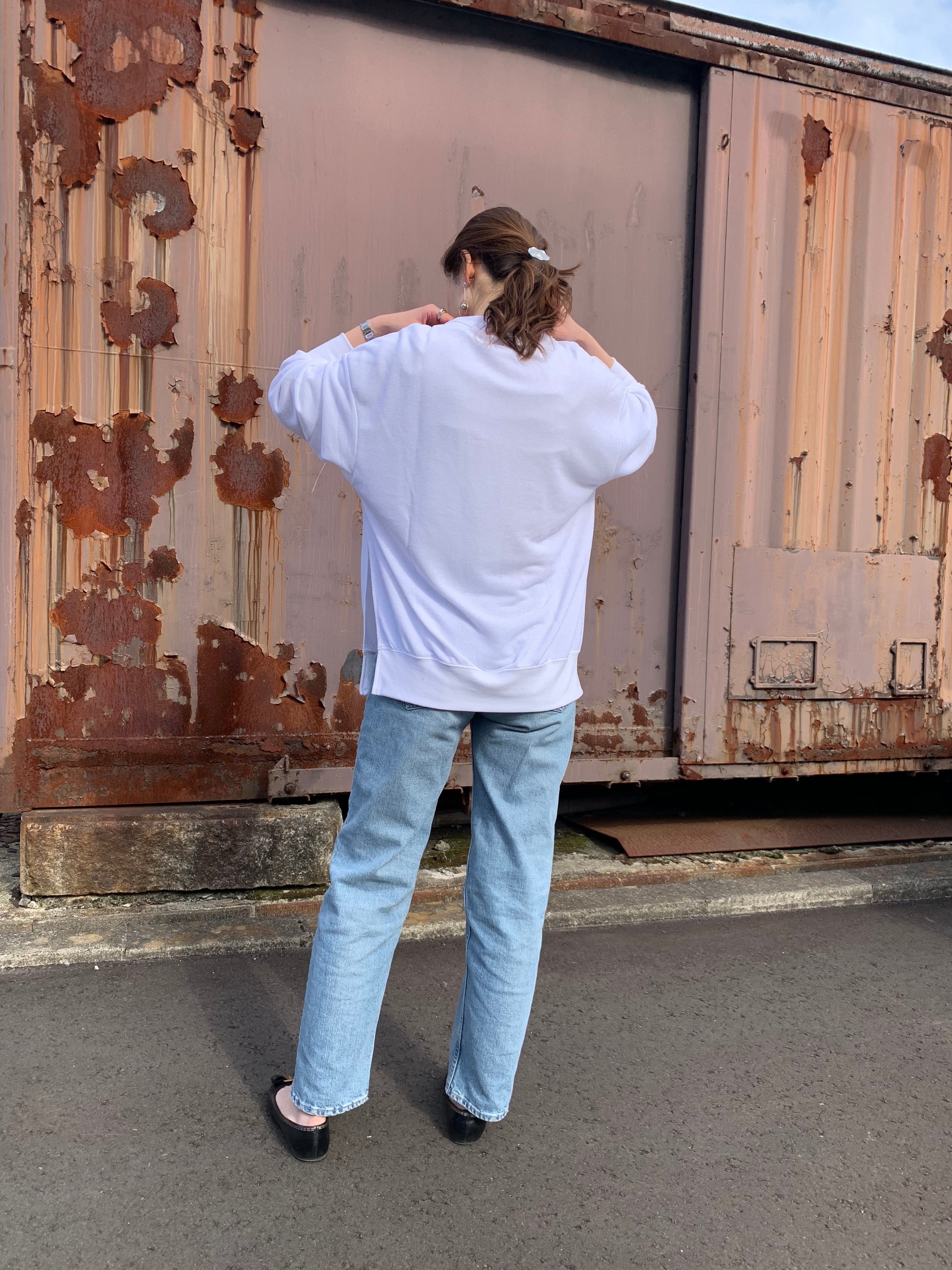身幅の広いオーバーサイズシルエットのスリット入りのロンT。
