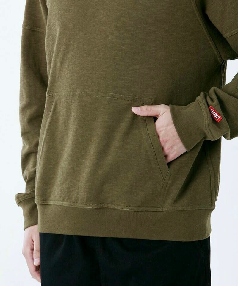フロントにカンガルーポケット、左袖にはCHUMSロゴのミニワッペンを配してアクセントに。