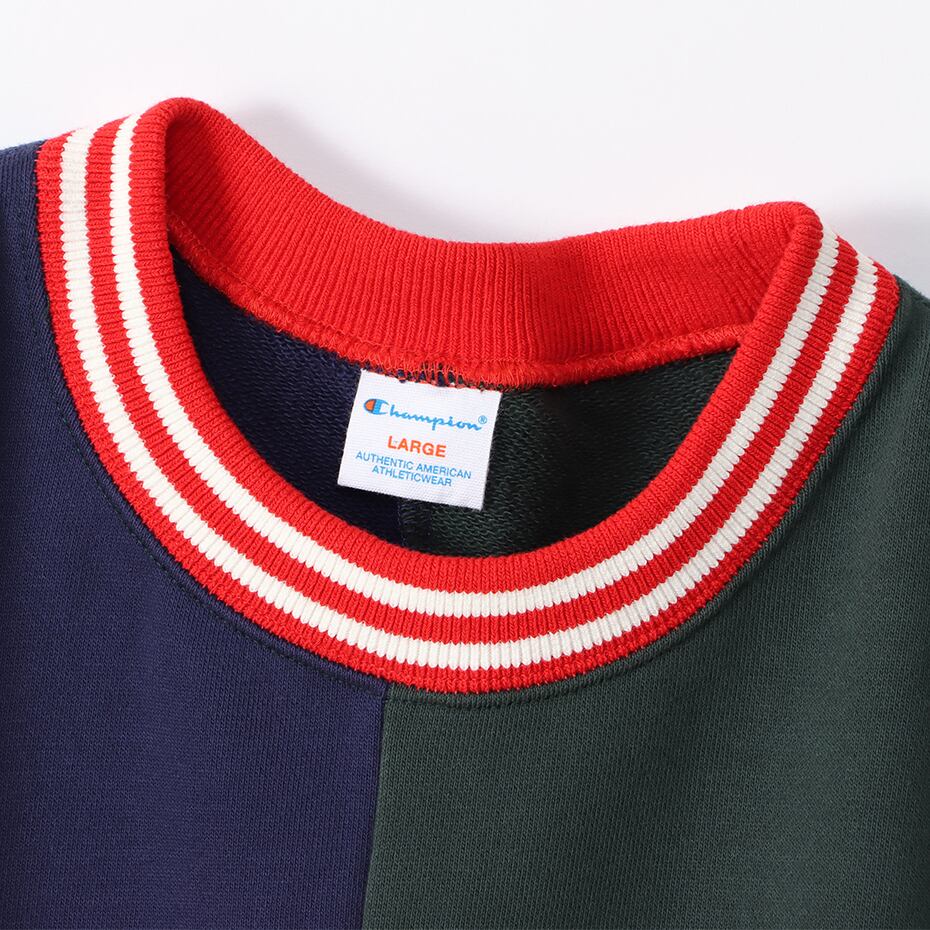 ネックと袖と裾はラインリブ仕様。身頃中央を異なるカラーで切り替え、左右で色の異なる